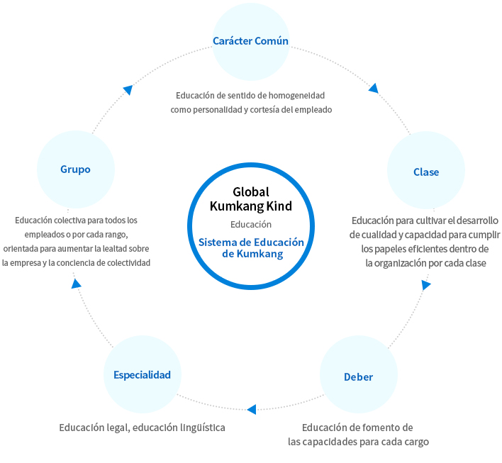 Kumkang Kind fortalece el apoyo educativo de forma selectiva para la mejora personal de los empleados ofreciéndoles una oportunidad de realización personal y está fomentando los expertos por cada campo mediante el estudio sobre las nuevas teorías y los casos avanzados.